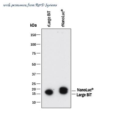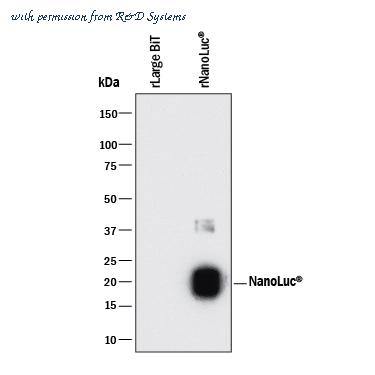 Detection of NanoLuc® Luciferase and Large BiT by Western Blot. Western blot shows Recombinant Large BiT and Recombinant NanoLuc®. PVDF membrane was probed with 2 µg/mL of Mouse Anti-Human NanoLuc® (Nluc) Luciferase Monoclonal Antibody (Catalog # MAB10026) followed by HRP-conjugated Anti-Mouse IgG Secondary Antibody (Catalog # HAF018 ). A specific band was detected for NanoLuc® and Large BiT at approximately 16 kDa (as indicated). This experiment was conducted under reducing conditions and using Immunoblot Buffer Group 1 .