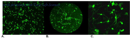 Figures: A. Chicken Embryonic Retinal Ganglia, B. Primary neuron lipofection, C. Embryonic rat primary hippocampal neuron